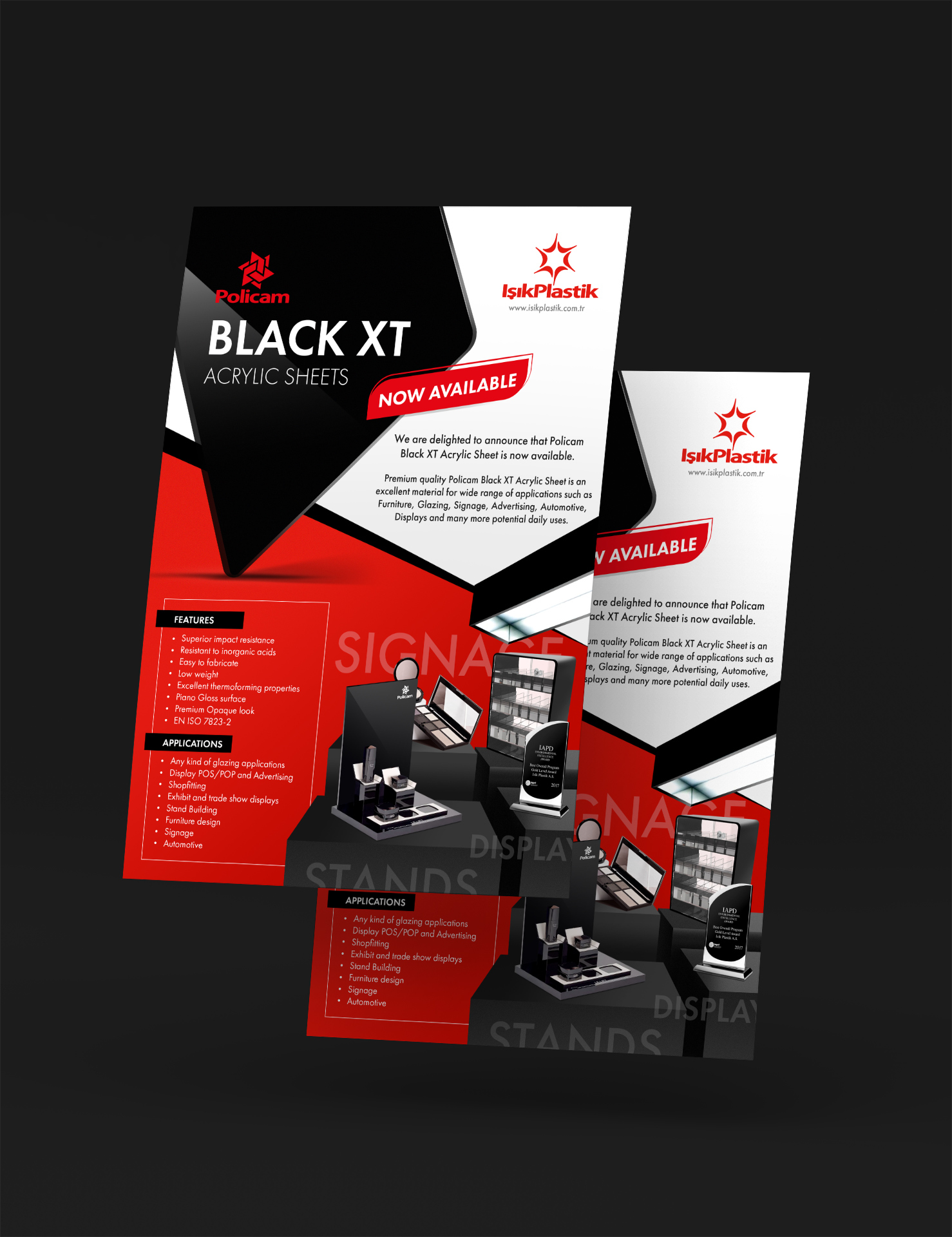 Işık Plastik, Policam markasıyla Black XT Akrilik Levha üretimine başladığını müşterilerine duyurmak istedi. Bu doğrultuda hem flyer / broşür tasarımı hem de mailing tasarımı için ortak bir görsel dizayn hazırlandı.