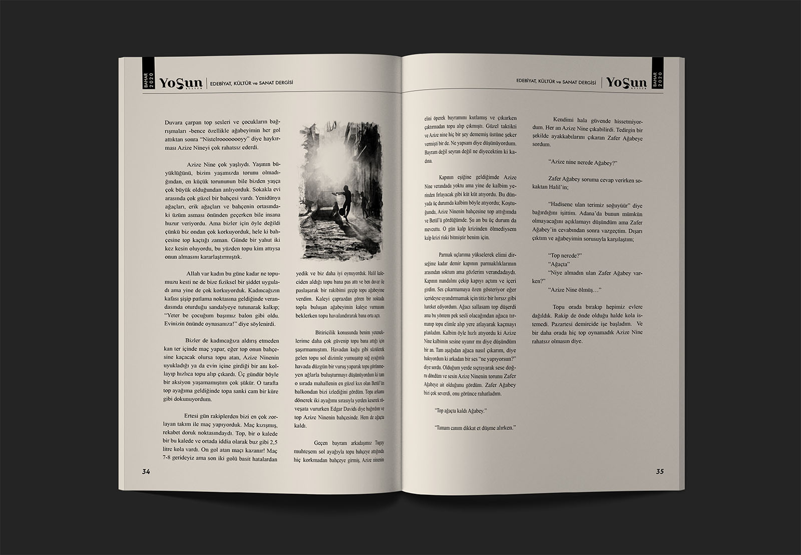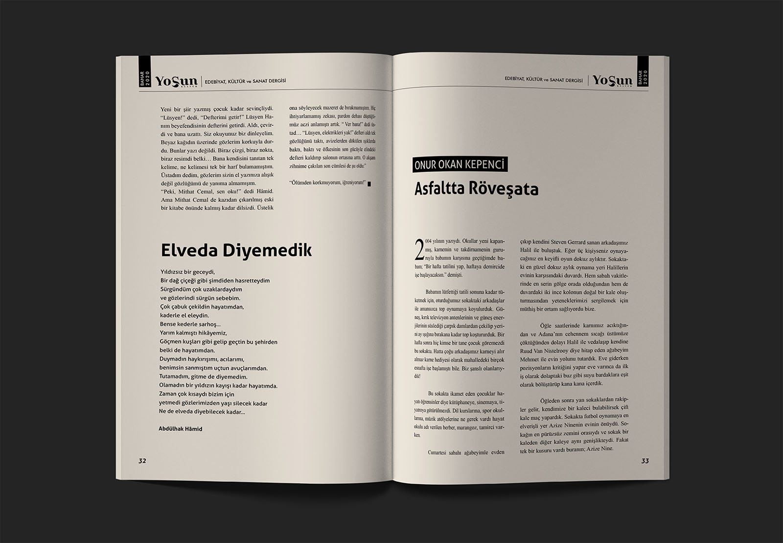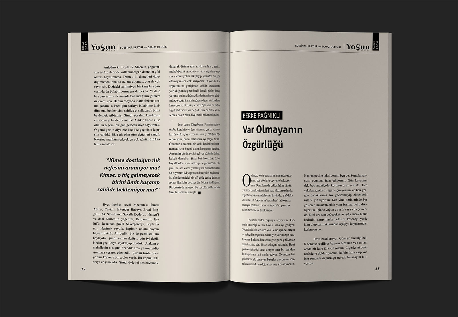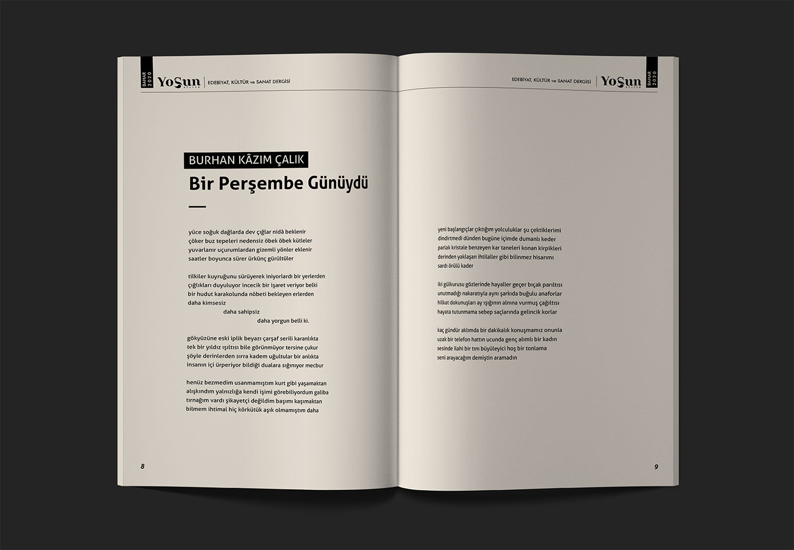 Yosun, edebiyat dünyasına yeni bir soluk getirmek isteyen yazarların oluşturduğu bir dergidir. Türk edebiyatına mütevazi bir katkı sunmak maksadıyla çıkılan bu yolda grafik tasarım konusunda birlikte çalışma fırsatı bulduk.